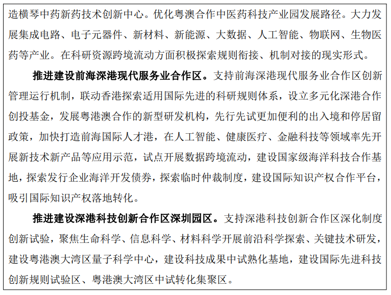 更好发挥港澳开放创新优势和广东产业创新优势,深化粤港澳在产业发展、技术攻关、创业孵化、科技金融、成果转化等领域协同创新,推动粤港澳三地实现更高水平的创新“一体化”发展。推动横琴粤澳深度合作区开发开放,全面深化前海深港现代服务业合作区改革开放,高水平建设深港科技创新合作区深圳园区。加快创新要素高效流动,积极促进粤港澳规则衔接和机制对接,争取国家授权开展创新要素出入境综合改革试点,推动税收优惠制度对接和科研仪器设备、生物样品跨境便利流通,研究实施促进三地人流、物流、工作、居住等更加便利化的政策措施,探索搭建粤港澳大型科学仪器设施资源共享平台。充分发挥粤港澳强强联手的独特优势,深入实施粤港、粤澳联合资助计划。大力推动港澳高校来粤合作办学,加强粤港澳高校教育科技交流,提升高等教育服务科技创新能力。发挥好粤港澳大湾区大平台影响力,强化国际创新资源集聚能力,促进全球科技成果来粤转移转化。