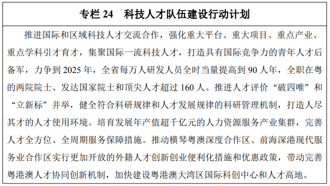 推动制定人才强省建设相关政策意见和行动方案,鼓励支持用人单位特别是国家实验室、省实验室等重大创新平台创新人才发展体制机制,推动建立科技领军人才负责制,建立充分体现知识、技术、成果等创新要素价值的收入分配机制,打造引才聚才育才良好制度环境。充分发挥粤港澳大湾区和深圳中国特色社会主义先行示范区政策叠加优势,支持深圳、广州等地大胆探索、先行先试,加快推进粤港澳人才合作示范区、深圳国际人才特区、广州南沙新区国际化人才特区建设,创建横琴粤澳深度合作区国际院士谷、中新广州知识城国际人才自由港。积极建设国际科技和人才交流合作基地,更加注重采用“小型化、区域化、专业化”模式开展海外人才来粤创新创业和交流合作活动。充分发挥深圳中国国际人才交流大会、高交会、广州海交会等国际大平台的主场优势,更大范围、更高层次开展创新人才交流。推动国际民间合作,拓展国际科技和人才民间组织交流合作新渠道,支持更多的海外名师、名家、名医、名匠、名人来粤合作交流。