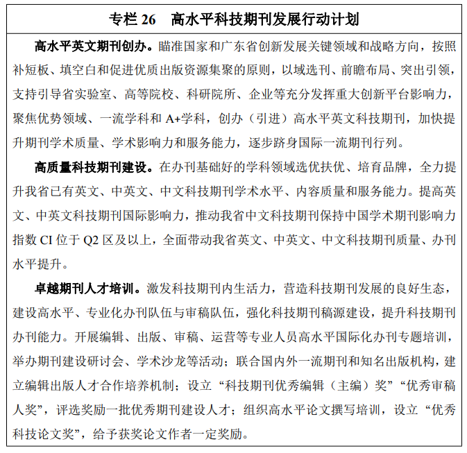 从完善科技创新体系大局出发,联合期刊主管部门,通过系统性顶层设计与制度创新,推动全省科技期刊建设高质量发展。在数学、物理、医学等基础和优势学科领域遴选一批优秀期刊做大做强,在前沿产业领域和新兴交叉领域创办(引进)一批高水平科技期刊,打造若干家国内一流的精品科技期刊,提升我省科技期刊学术影响力和核心竞争力。加强办刊人才队伍建设,定期开展编辑、出版、审稿、运营等专业人员培训,会同一流期刊联合培养编辑出版人员,对优秀论文作者、优秀编辑人员予以适当奖励。扩大优化科技期刊稿源,推动中外科技期刊同质等效,吸引国内外高水平论文在我省科技期刊首发。到2025年,通过提升期刊学术引领能力和国际传播能力,使全省进入国内权威期刊数据库收录的科技期刊数量达80家以上,进入国外重要数据库收录的科技期刊达20家以上,跻身世界一流阵营的科技期刊数量明显增加。